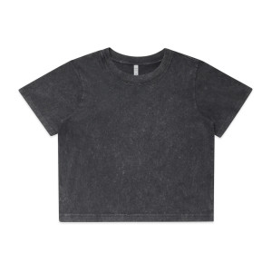 The AS Colour Women\'s Stone Wash Heavy Crop Tee has a stone washed finish for that vintage/worn look. Crafted from 100% carded cotton for durability and comfort. With a heavy 220 GSM weight, it features a cropped length and relaxed fit, shoulder to shoulder tape, and twin-stitched wide neck ribbing.